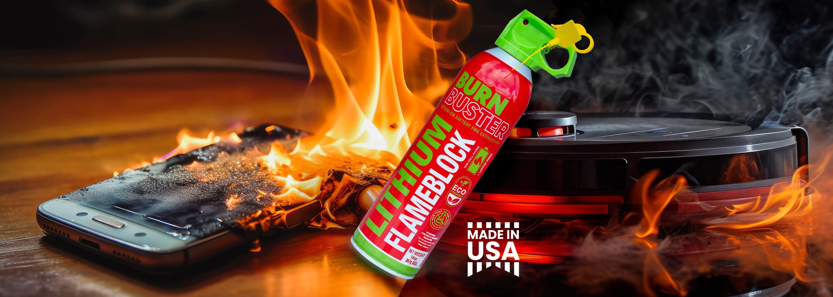 The BurnBuster Lithium-Ion Battery Fire Extinguisher is a revolutionary fire safety solution designed specifically to combat fires caused by lithium-ion batteries. Whether it's a cell phone, laptop, or other small electronics, BurnBuster is your go-to tool for effectively neutralizing battery fires.