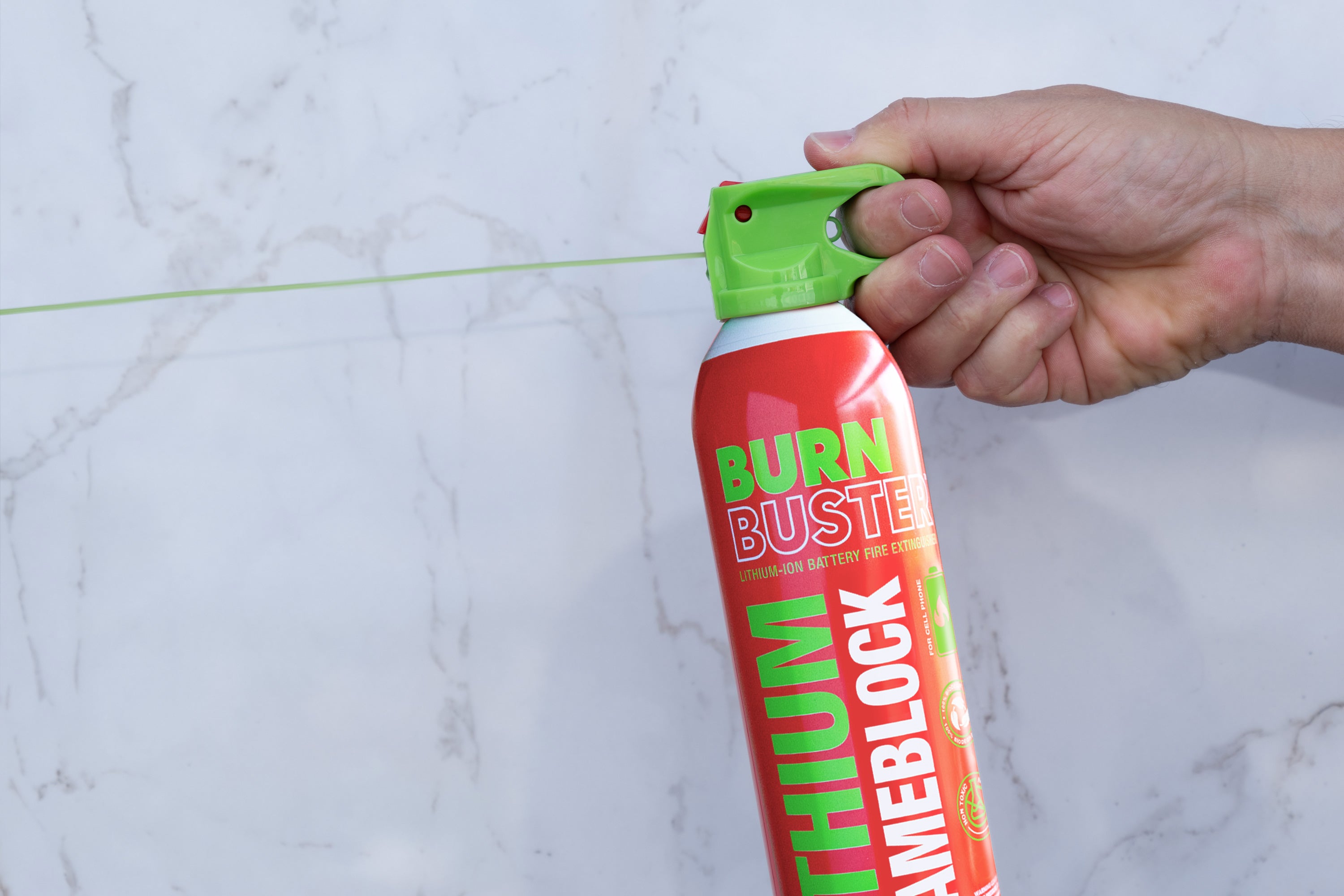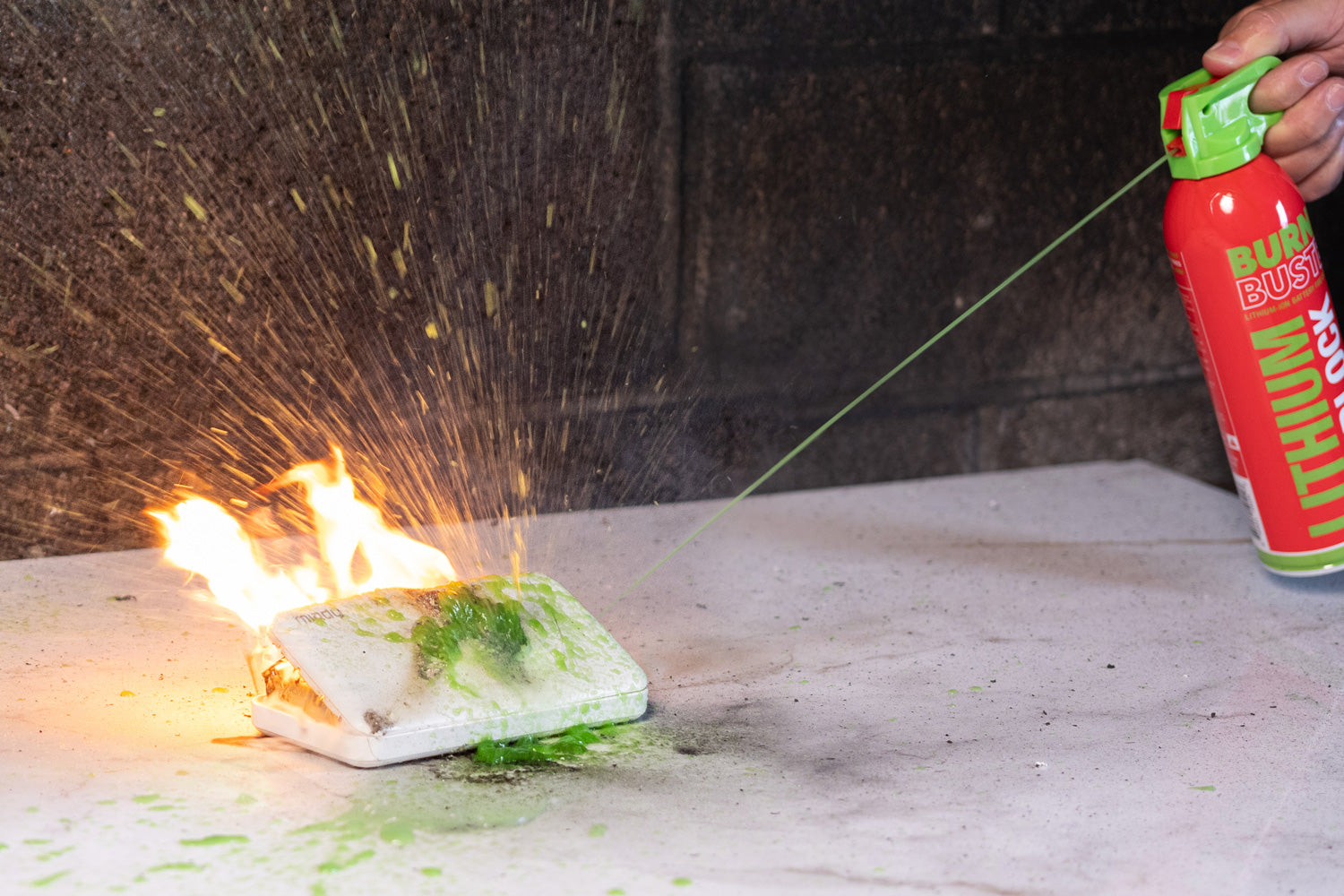 BurnBuster is designed to effectively extinguish lithium-ion battery fires by creating a cooling and insulating layer on the burning surface. BurnBuster's superior encapsulating abilities, covering and affixing to the battery, form a protective layer which removes the heat, separating the oxygen from the fuel.