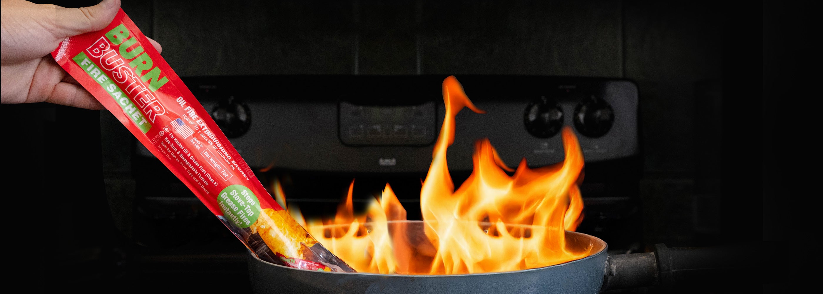 BurnBuster Fire Sachet is a quick, safe solution for extinguishing dangerous oil and grease pan fires in residential kitchens, effective for use on up to 1 gallon of hot oil.